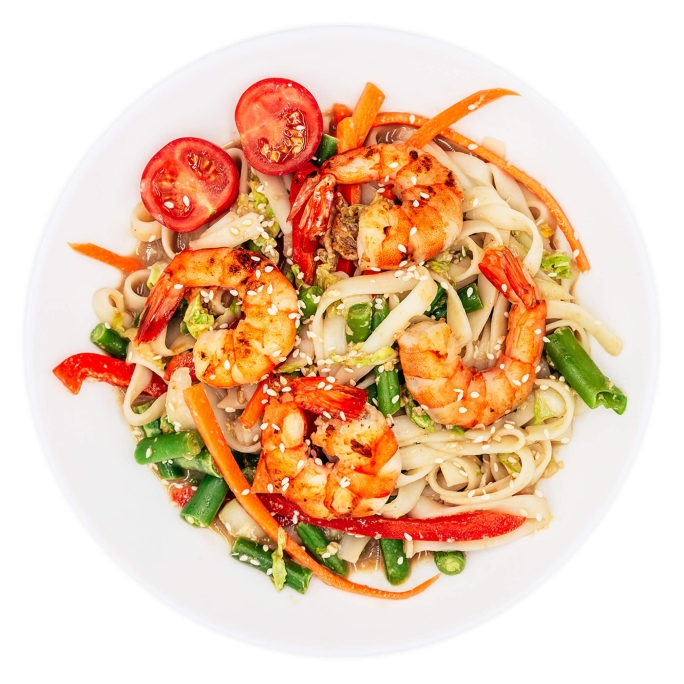 удон, креветки, соус терияки, паприка, фасоль стручковая, капуста пекинская, морковь, черри, кунжут, яйцо куриное